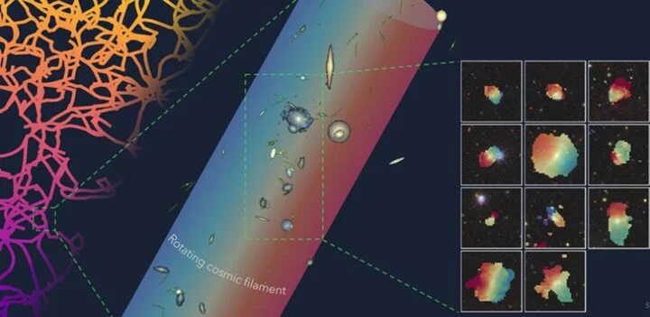 An international team led by the University of Oxford has identified one of the largest rotating structures ever reported: a “razor-thin” string of galaxies embedded in a giant spinning cosmic filament, 140 million light-years away.